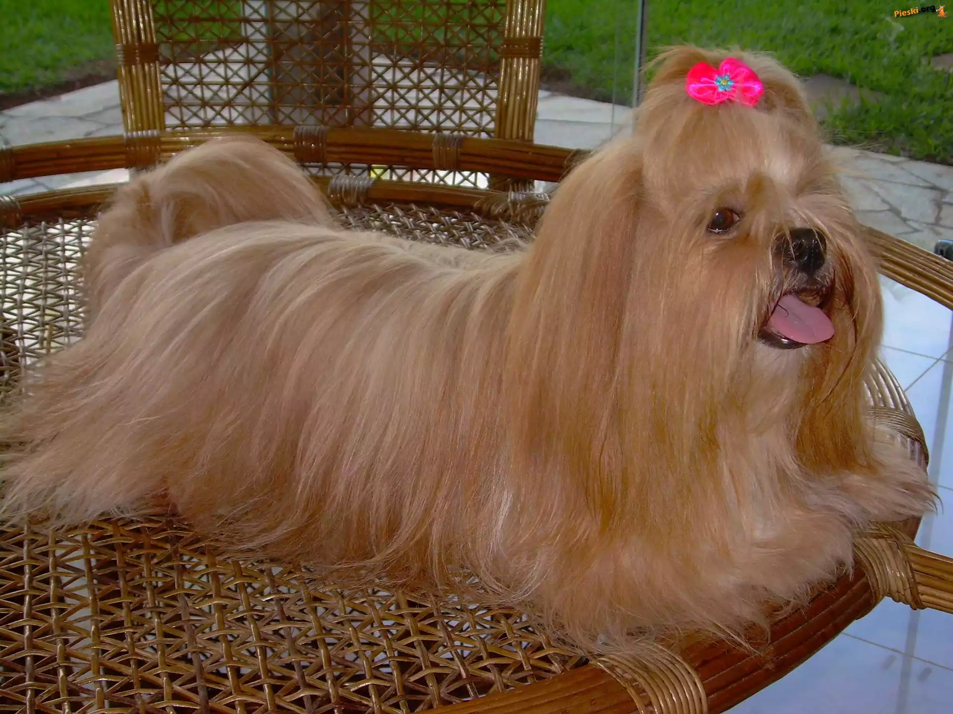 Pies, Różowa, Gerbera, Lhasa Apso Lana Del Rey, Pies, Lhasa Apso wyczesany, Lhasa Apso Lhasa Apso, kokardka Malutki piesek, Lhasa Apso