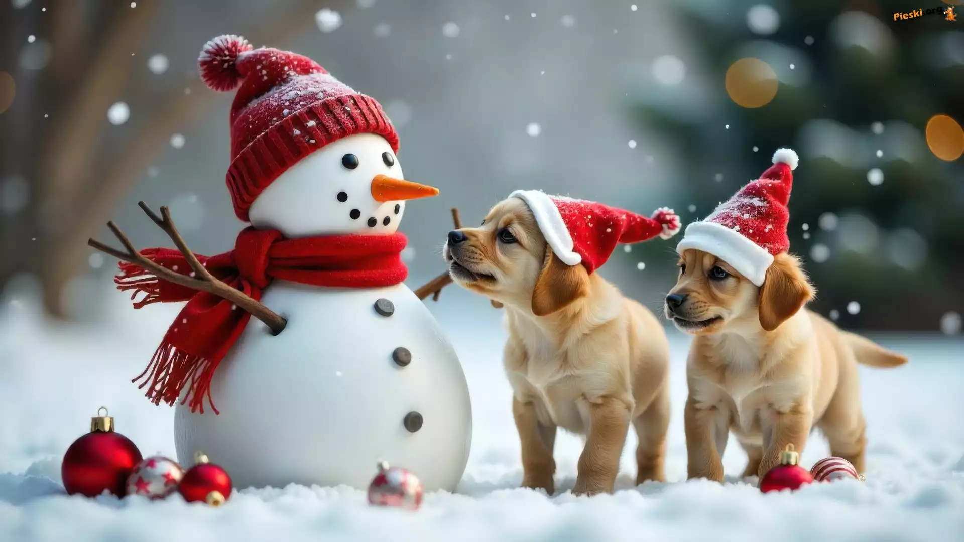 Bombki, Psy, Szczeniaki, Bałwanek, Zima, Czapki, Mikołaja