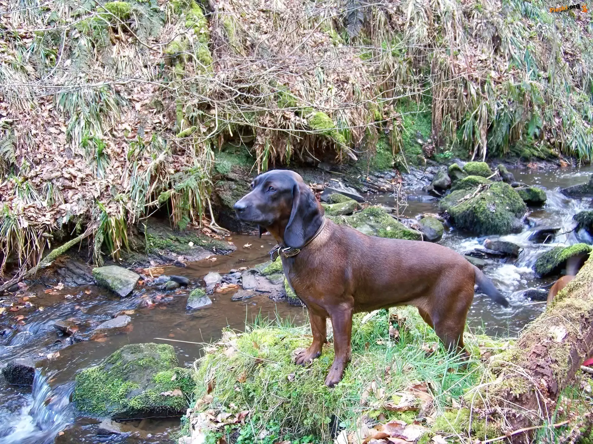 leżący, Posokowiec bawarski, jęzor obroża, Posokowiec bawarski, jasna, śnieg Posokowiec bawarski, wodospad Posokowiec bawarski, rzeka