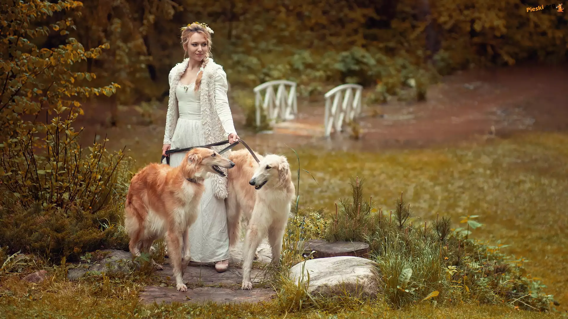 Charty, Rosyjskie Psy, Blondynka, Kobieta, Dwa, Charty rosyjskie borzoj Rosyjski, Pies, Chart, Borzoj Borzoj, Kobieta, Pies, Chart rosyjski Pies, Chart rosyjski, Borzoj