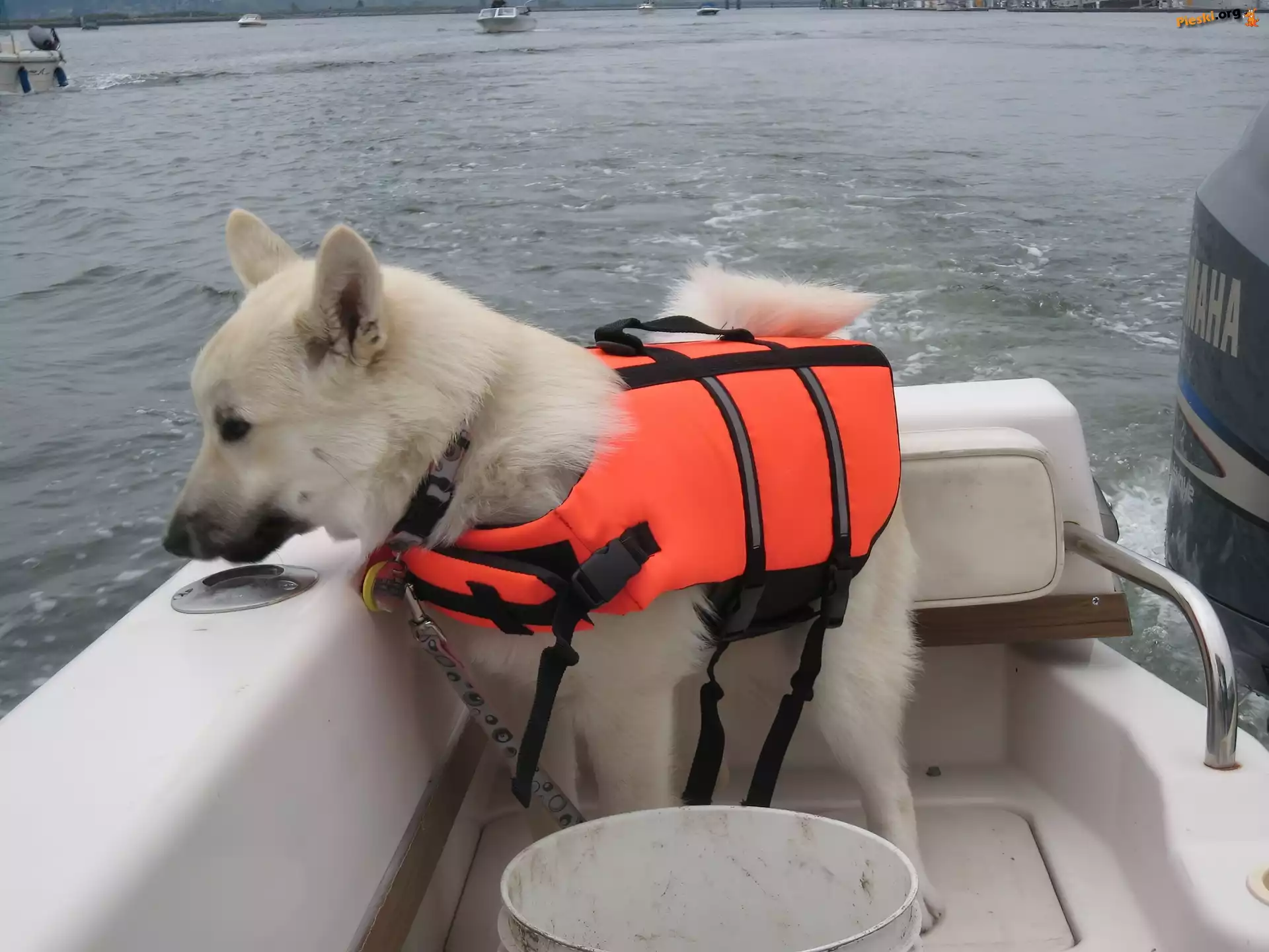 Norsk Buhund, kapok Ziewający, Norsk Buhund Przyczajony, Norsk Buhund Norsk Buhund, pomarańczowy, kapok Norsk Buhund, fale, motorówka Norsk Buhund, zima