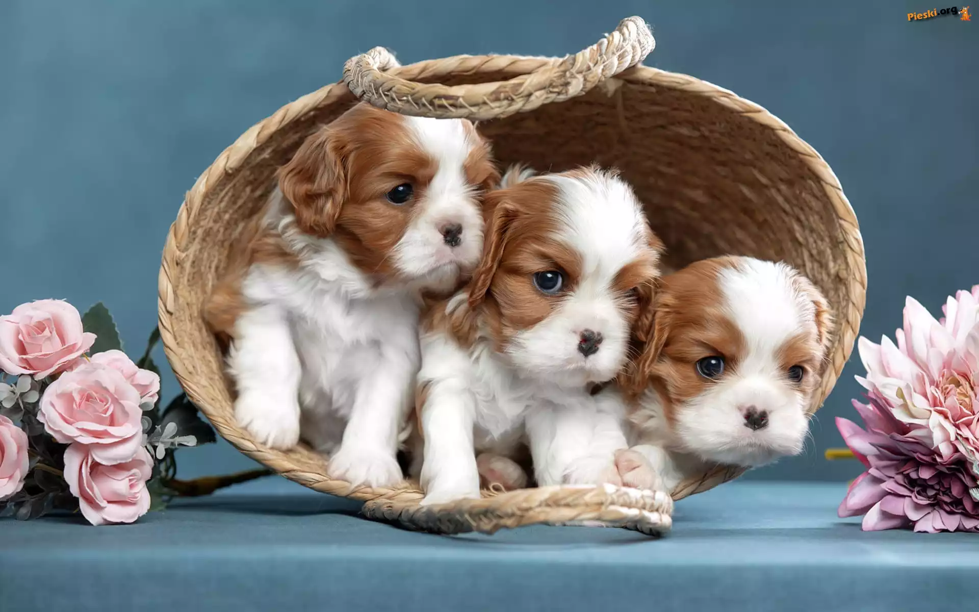Cavalier king charles spaniel, Koszyk, Kwiaty, Chryzantemy, Róże, Psy, Szczenięta, Trzy
