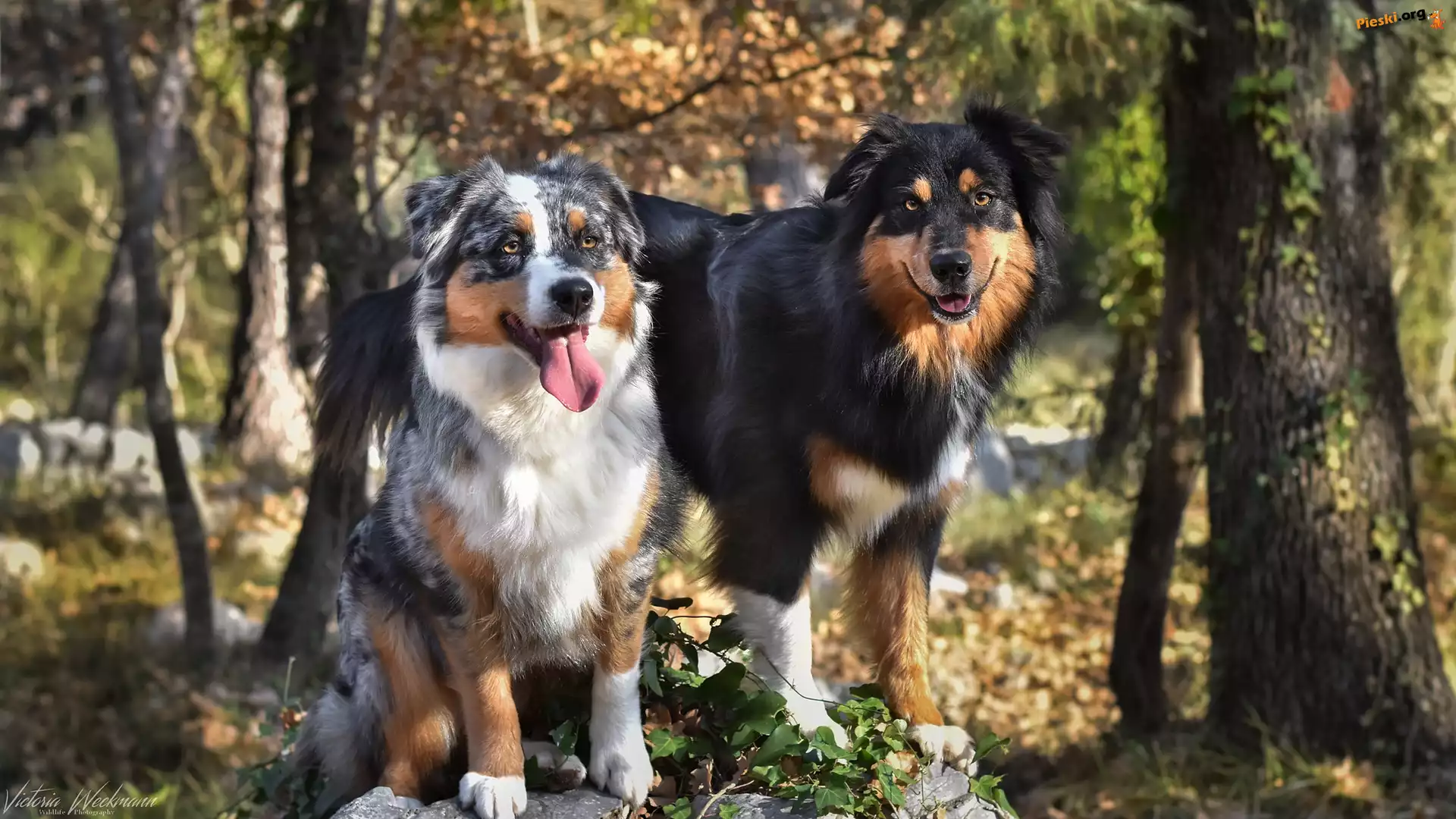 Dwa, Drzewa, Las, Psy, Owczarki australijskie, Rośliny, Pieski