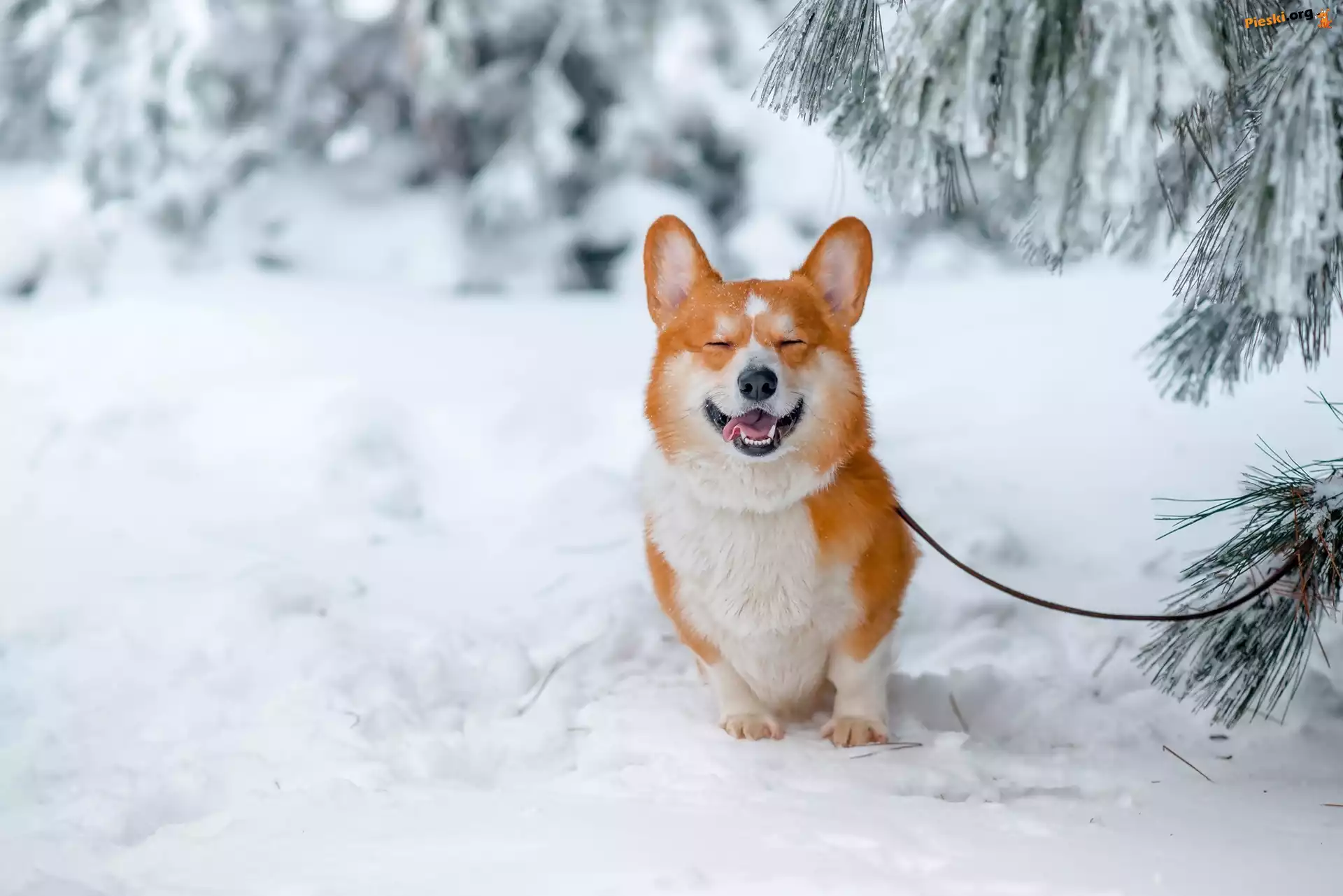 Drzewa, Welsh corgi pembroke, Las, Zima, Pieski