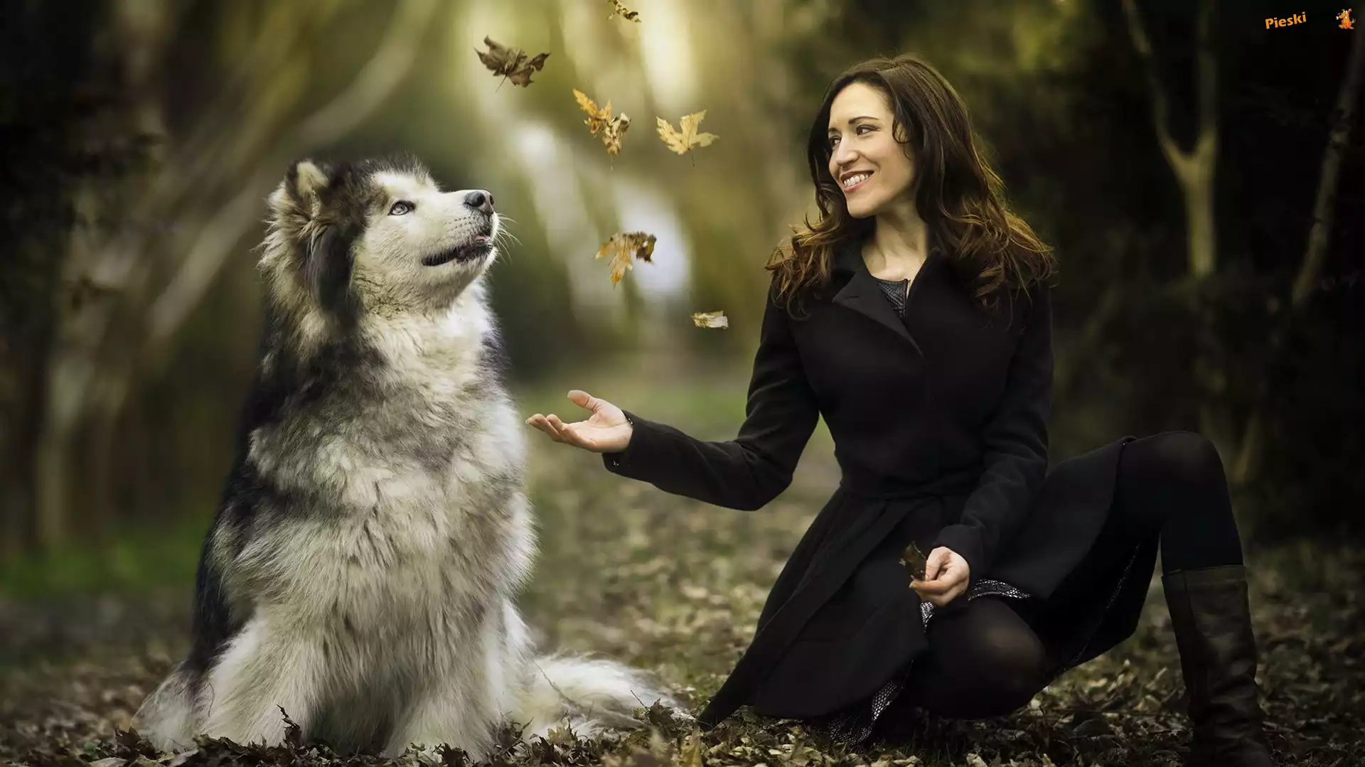 Kobieta, Pies, Alaskan malamute, Liście, Pieski