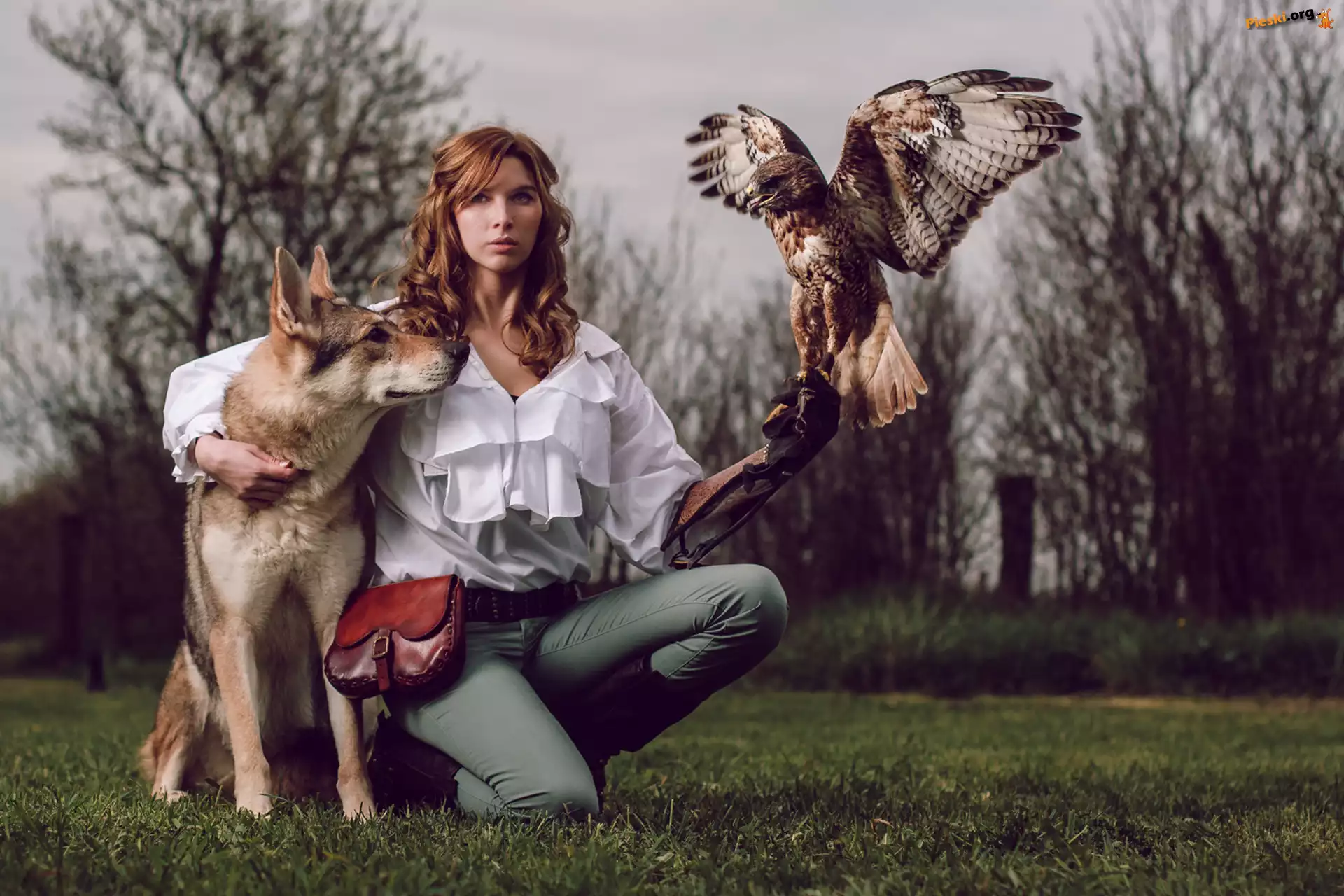 Kobieta, Owczarek niemiecki, Sokół, Pieski