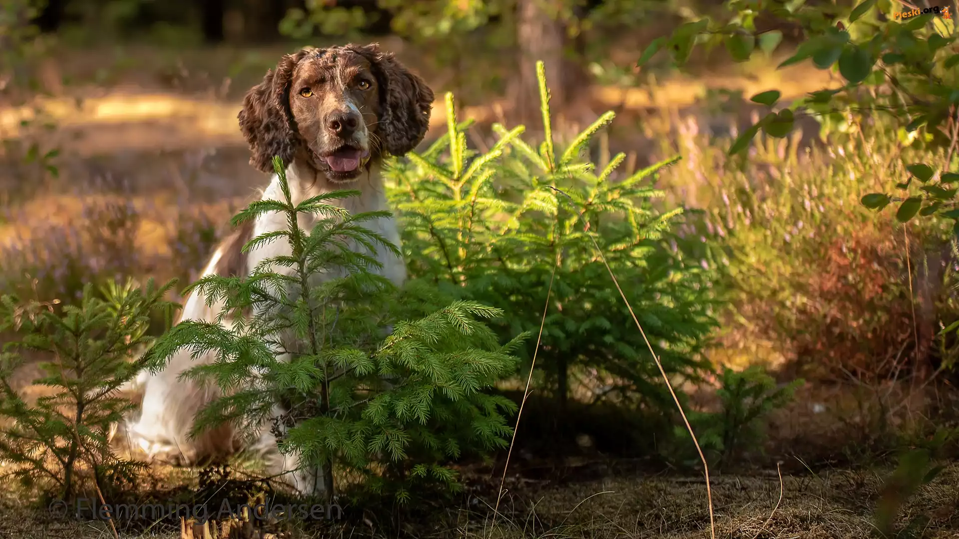 Świerki, Pies, Łąka, Las, Springer spaniel angielski, Drzewka, Kwiaty, Pieski