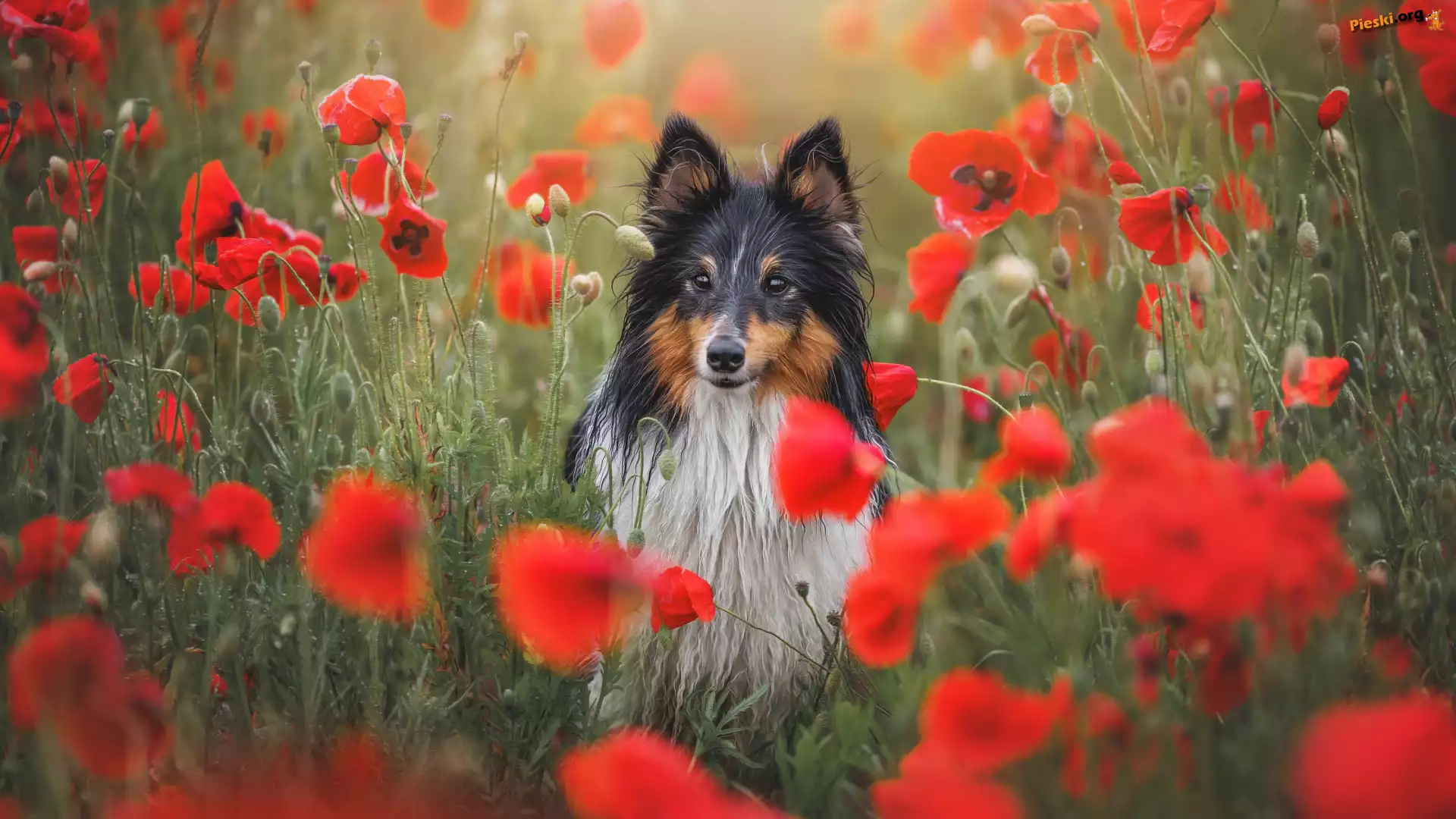 Maki, Kwiaty, Pies, Owczarek szetlandzki