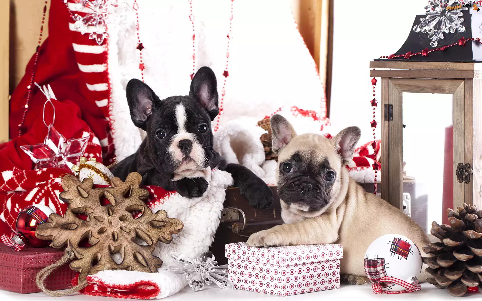 Prezenty, Dwa, Bombka, Psy, Szyszki, Buldogi francuskie, Szczeniaki, Gwiazdki, Lampion, Pieski