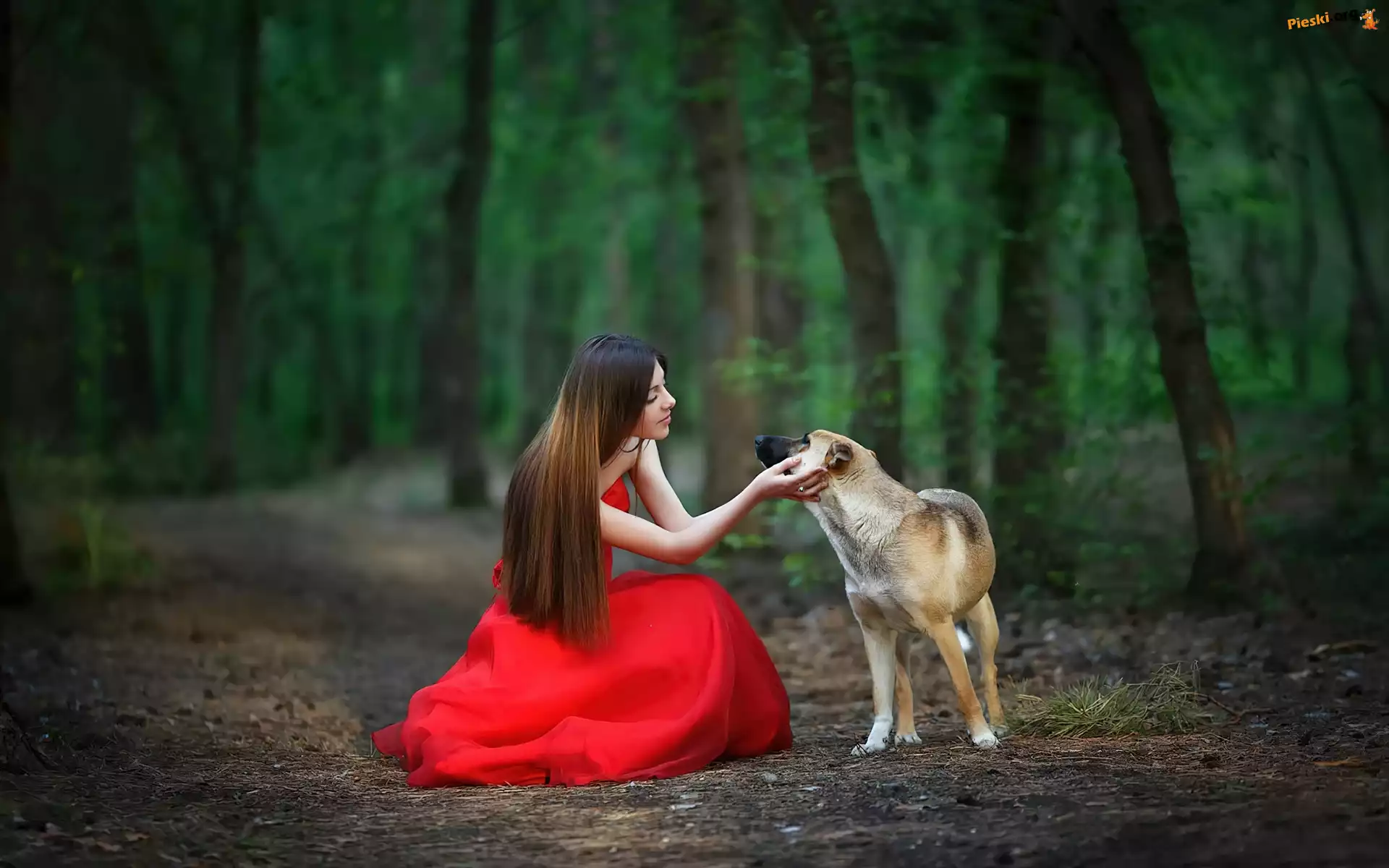 Sukienka, Pies, Dziewczyna, Las, Czerwona, Pieski