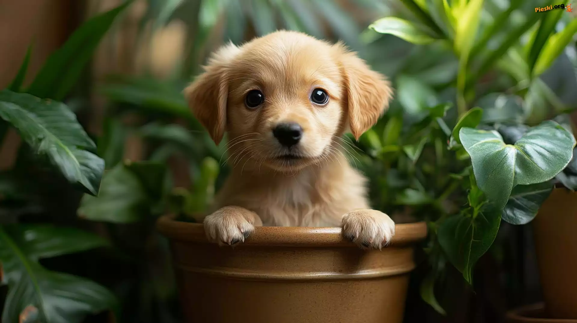 Spojrzenie, Liście, Pies, Donica, Szczeniak, Pieski