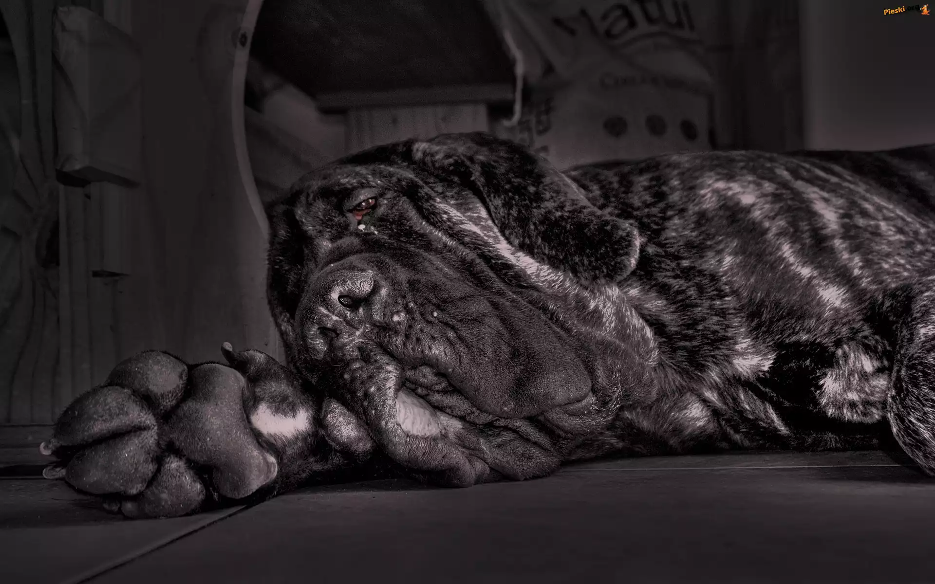 Pies, Mastif, Neapolitański Morda, Mastifa neapolitańskiego Mastif, Odpoczynek Mastif neapolitański, Pies, Szczeniak, Fotel Mastif neapolitański, szare, umaszczenie Mastif neapolitański, czerwona, obroża