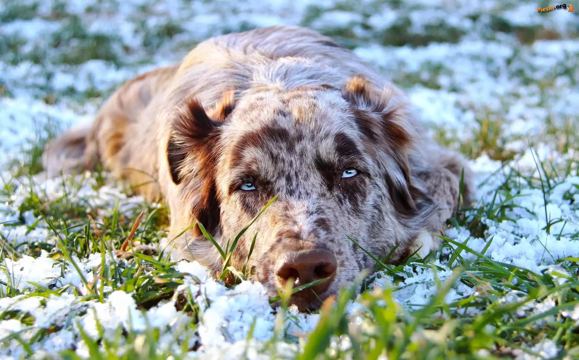 Śnieg, Owczarek australijski, Leżący, Australian shepherd, Trawa