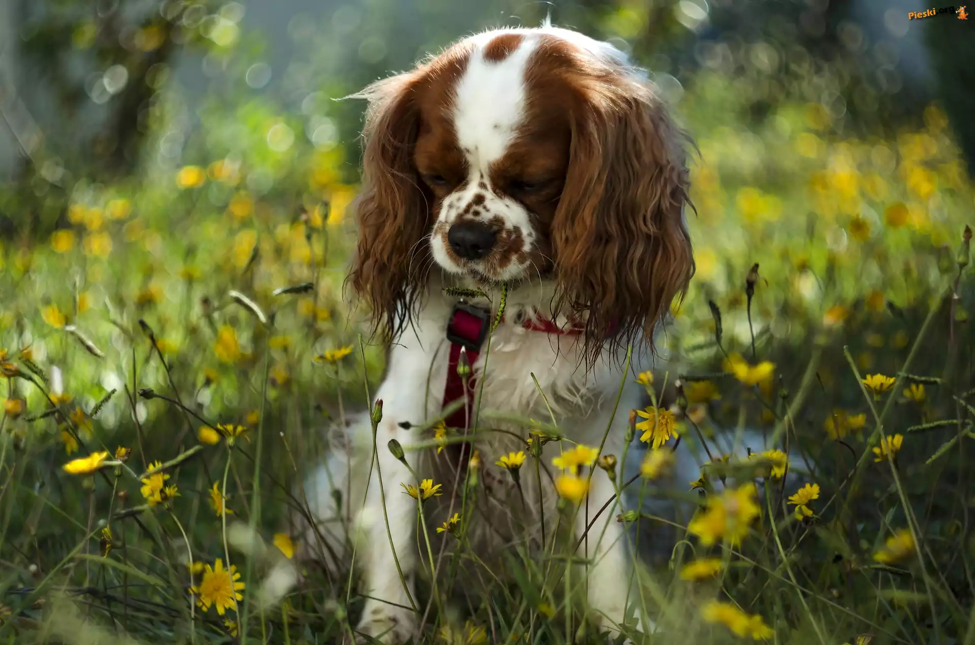 Żółte, Pies, Cavalier king charles spaniel, Kwiaty