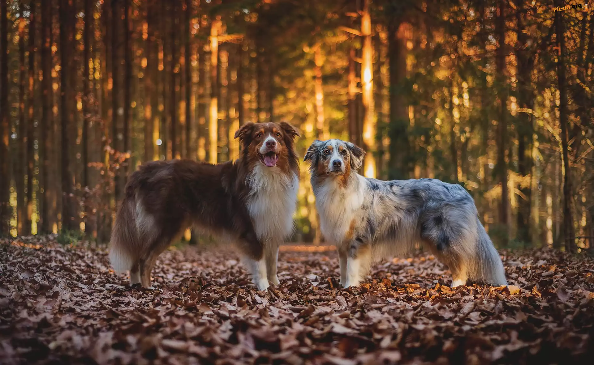Jesień, Owczarki australijskie, Psy, Las, Dwa, Liście, Pieski