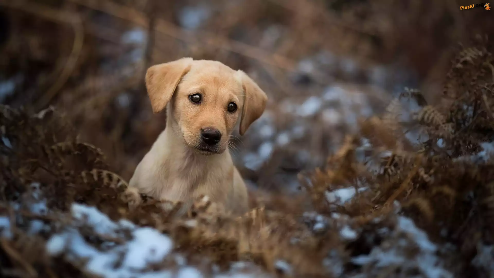 Szczeniak, Paproć, Liście, Labrador retriever, Suche, Śnieg, Pieski