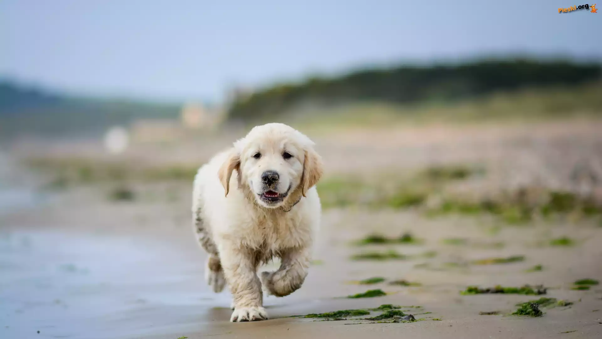 Plaża, Szczeniak, Golden retriever, Woda, Pieski