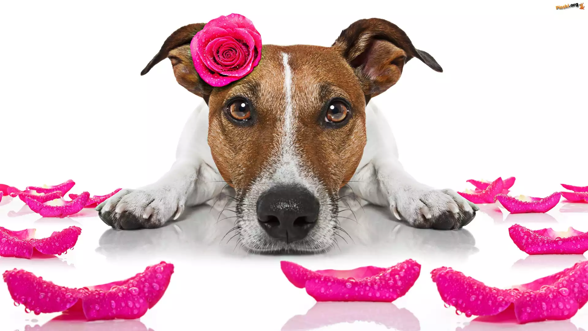 Pies, Róża, Różowa, Jack Russell terrier, Mordka, Płatki, Pieski