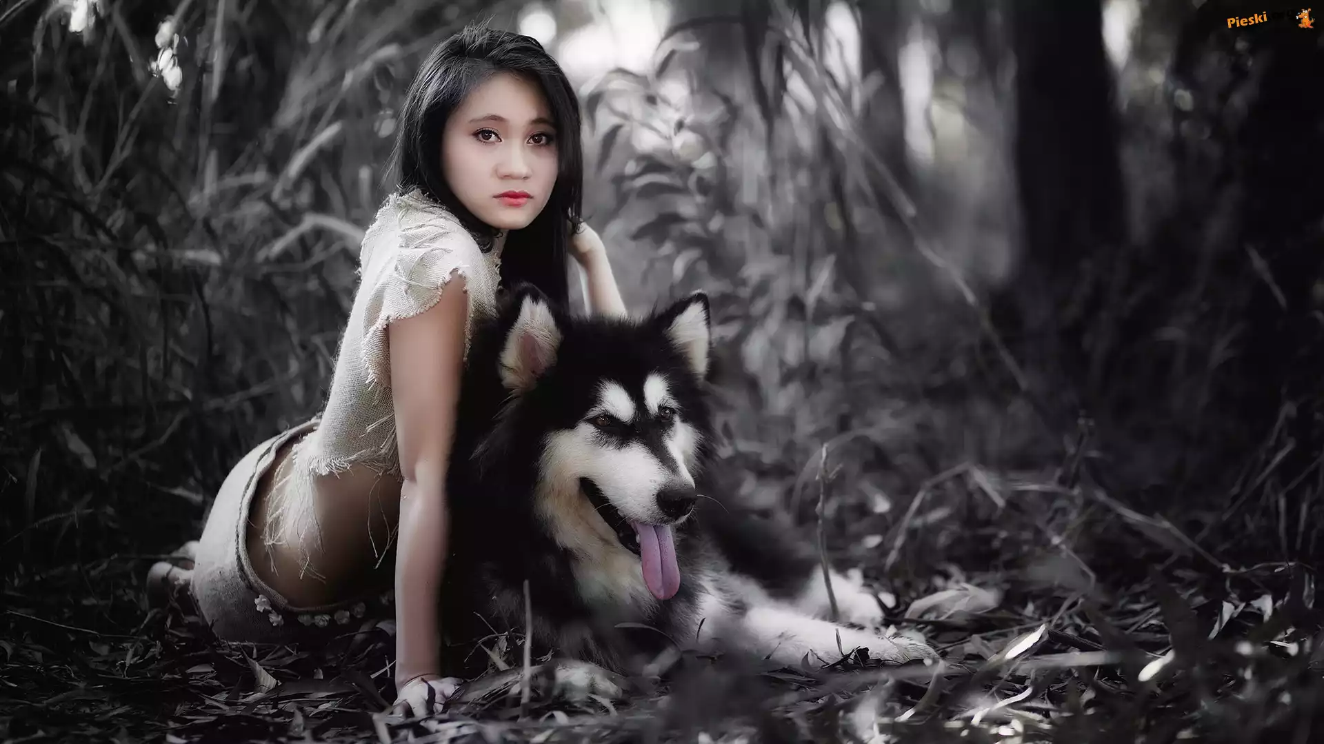 Kobieta, Rozmyte, Rośliny, Azjatka, Alaskan Malamute, Tło
