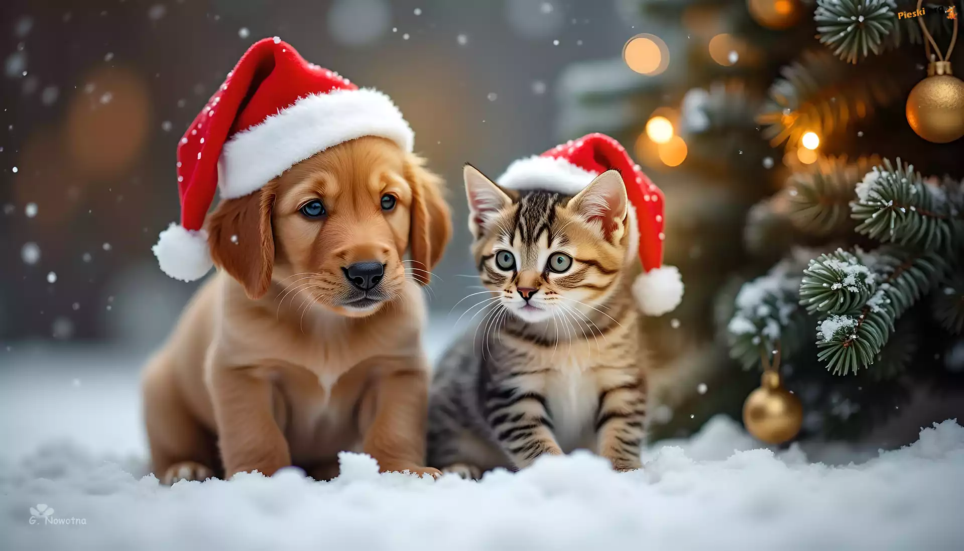 Grafika, Kot, Czapki, Śnieg, Szczeniak, Mikołaja, Choinka, Pieski