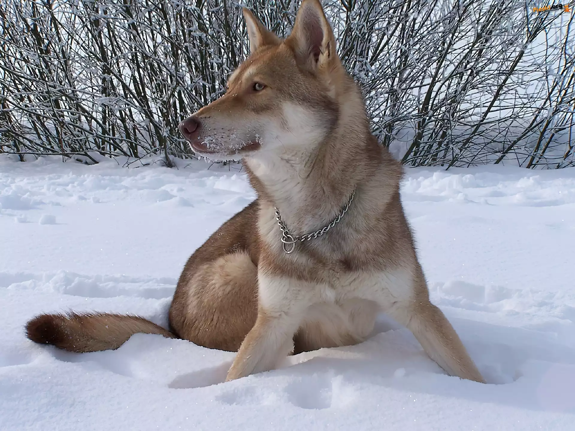 Saarlooswolfhond, woda trzy, Saarlooswolfhond Saarlooswolfhond, uszy, postawione Saarlooswolfhond, śnieg, krzaki