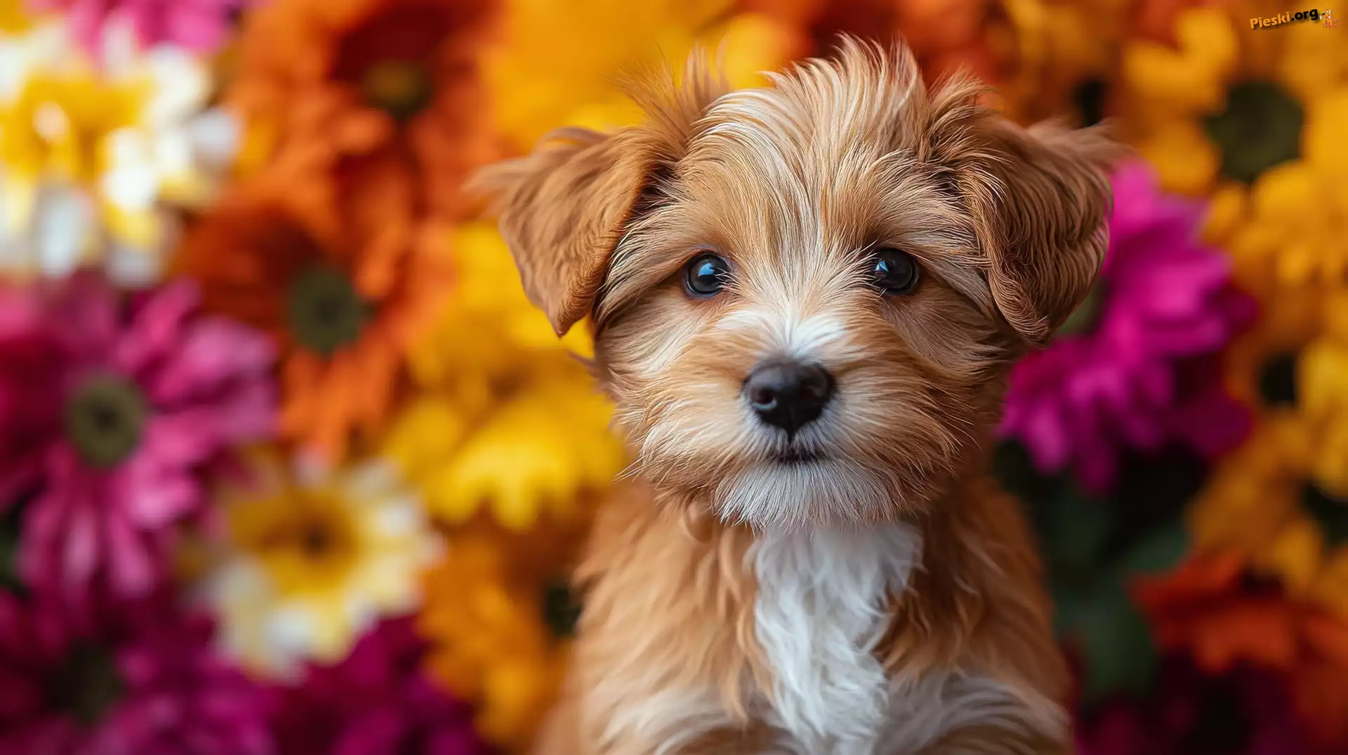 Kwiaty, Szczeniak, Pies, Rudo-biały, Pieski