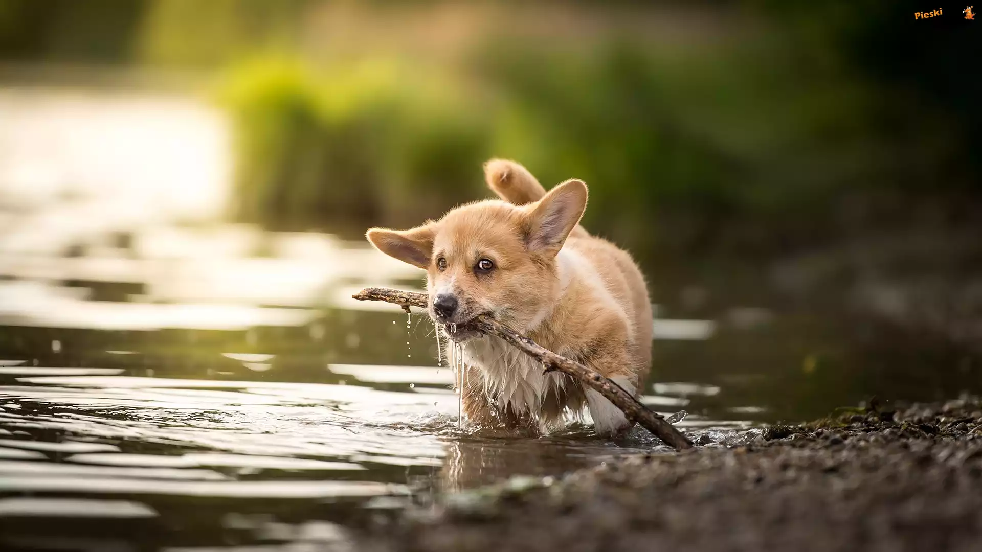 Woda, Szczeniak, Pies, Welsh corgi pembroke, Patyk, Pieski