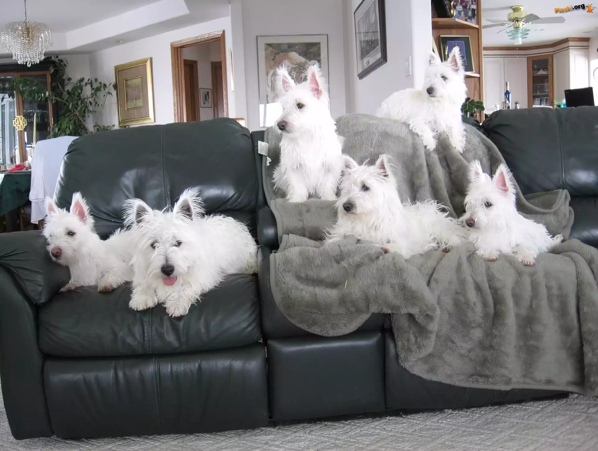 czarna, sześć, West Highland White Terrier, kanapa, Pieski