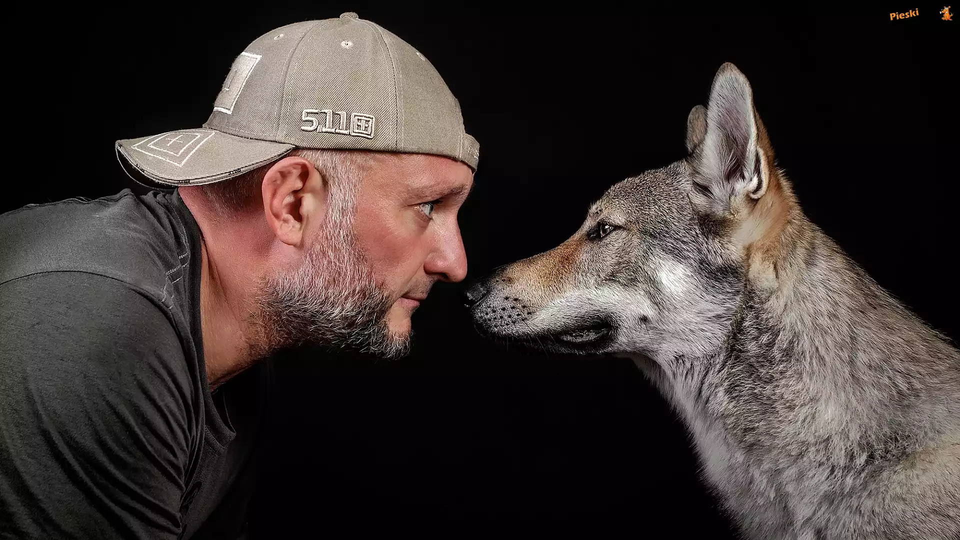Profil, Mężczyzna, Czarne, Czapka, Spojrzenie, Pies, Broda, Wilczak czechosłowacki, Tło, Pieski