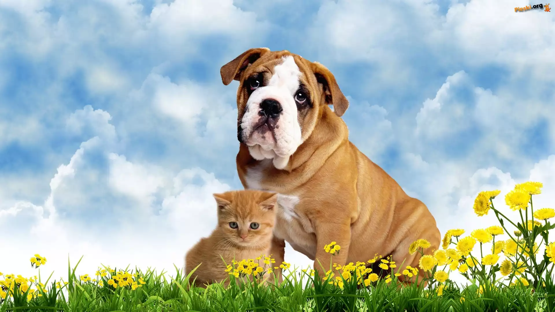 Trawa, Kot, Pies, Niebo, Art, Pieski