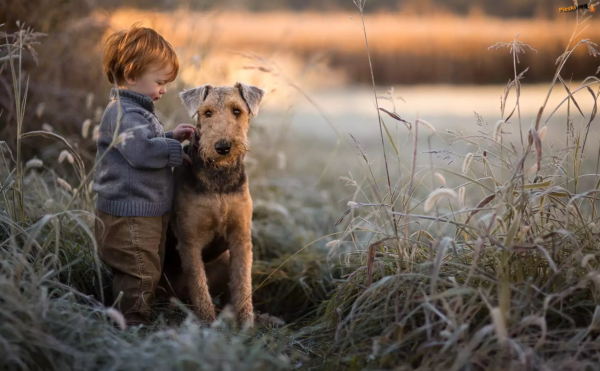 Trzciny, Airedale terrier, Pies, Chłopiec, Trawy, Pieski